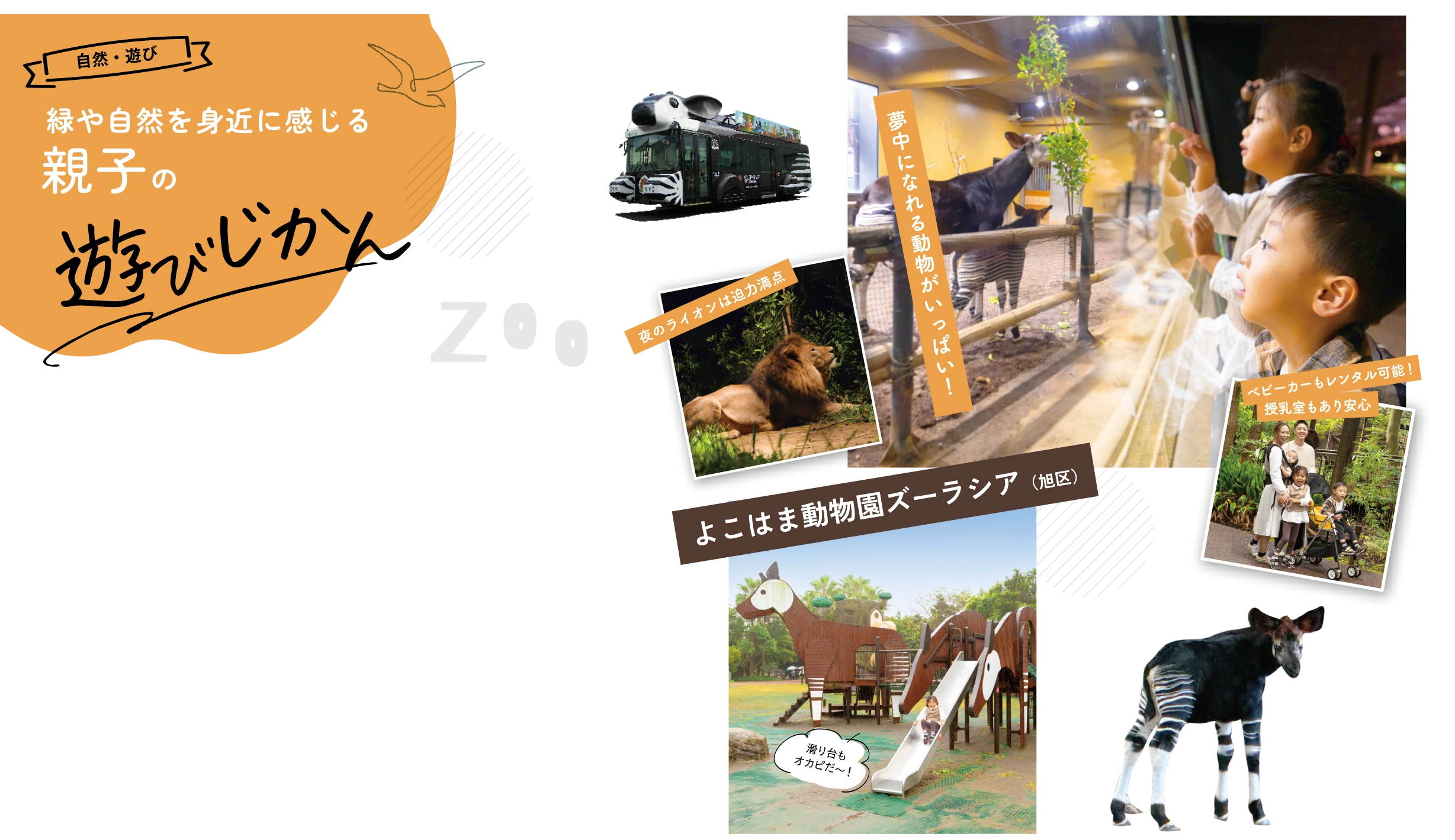 オカピの滑り台や、オカピデザインの園内バスにも注目(写真左下)。